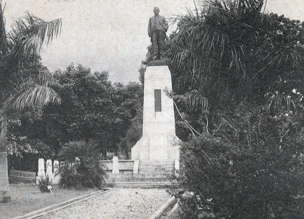 This larger-than-life bronze statue was erected in honor of Haruji Matsue (1876-1959) who established the commercial sugar industry in the Northern Mariana Islands in the pre-World War II years. In 1920, Matsue conducted a thorough inspection of the island during which he became convinced that Saipan had excellent potential for sugarcane agriculture. In 1922, he established the Nan’yô Kohatsu Kabushiki Kaisha (South Seas Development Company) better known as NKK or “Nankô”. Under Matsue’s direction, Nankô established three large sugarcane plantations on Saipan. Cane stalks from these plantations were brought to Nankô’s modern processing mill in Chalan Kanoa via an elaborate system of rail lines that connected all points of the island. Nankô also established sugar plantations and processing mills on the islands of Tinian and Rota. The sugar industry was the most successful commercial enterprise in Japan’s South Seas territories. By the mid-1930s Nankô accounted for over 60% of the total South Seas revenues. This statue of Matsue, dedicated in 1934, recognizes the important economic contributions of the man who came to be called “The Sugar King.” Surprisingly, it survived the devastating World War II battle of Saipan with only minor damage. The area surrounding the Matsue’s statue is now called “Sugar King Park.”
